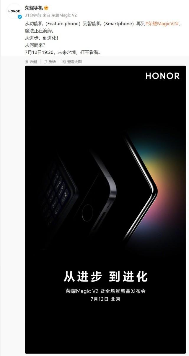 核心提示:荣耀手机官方宣布,即将发布荣耀MagicV2折叠屏手机,并确定发布时间为7月12日晚19:30。目前,荣耀MagicV2已经开始接受预约。有关消息显示,荣耀CEO赵明在微博上发表了一篇长文,表示对...