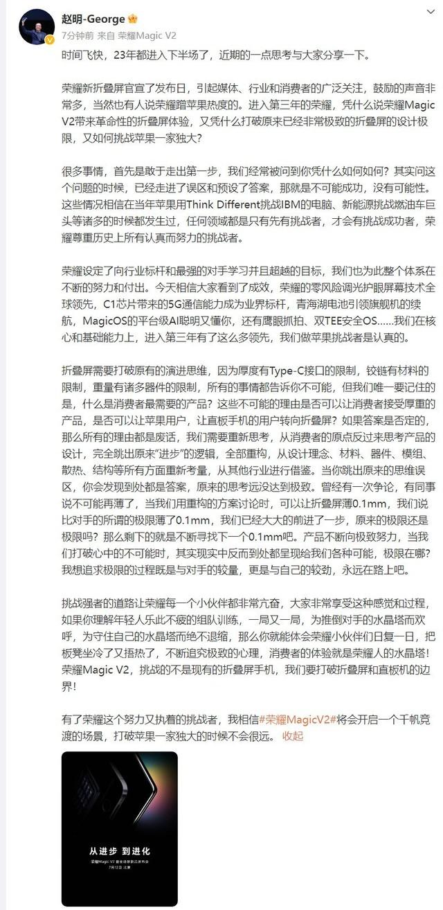 有关消息显示,荣耀CEO赵明在微博上发表了一篇长文,表示对于手机的薄度进行了讨论。他提到,曾经有人认为手机无法再变得更薄,但通过重构方案,他们成功将折叠屏幕厚度减少了0.1毫米。他说这已经比其他竞争对手所谓的极限更薄了0.1毫米,这是他们迈出的一大步。赵明还表示,目前最薄的大折叠屏手机是华为Mate X3(5.3毫米),而他们希望再减少0.1毫米,也就是Magic V2的厚度大约在5.2毫米左右。