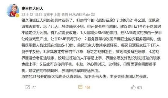 因此,原计划于去年9月公测的《原始征途》,因史玉柱的一条微博而延期公测,针对氪金度、单区玩家人数、新手友好度等问题,他对团队提出了新的要求,尤其是核心玩法的打磨。