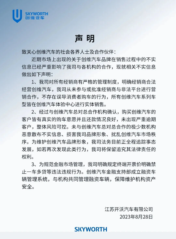 近期市场上出现的关于创维汽车品牌在销售过程中的不实信息已经严重影响了我司与各机构的合作,现就相关不实信息做出如下声明: