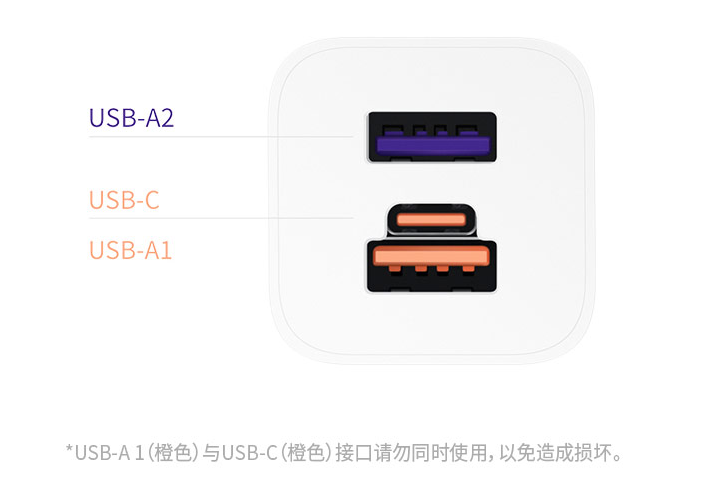 该充电器具备两个 USB-A 型接口,一个 Type-C 接口,两个橙色的接口紧挨在一起,目的是为了避免同时使用。