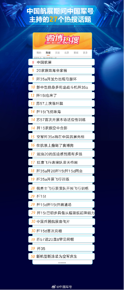此次航展,微博上有500+媒体机构参与报道,@人民日报@央视新闻@中国军号@解放军报@央广军事 等媒体全程实时跟进,让网友们可以更加全面、立体化地了解航展内容。