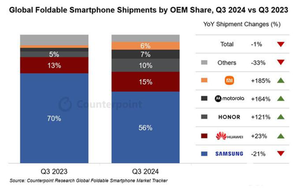 近日,知名调研机构Counterpoint发布了2024年Q3全球折叠屏市场报告,全球折叠屏手机销量首次同比下跌1%,结束了连续六个季度的增长态势。