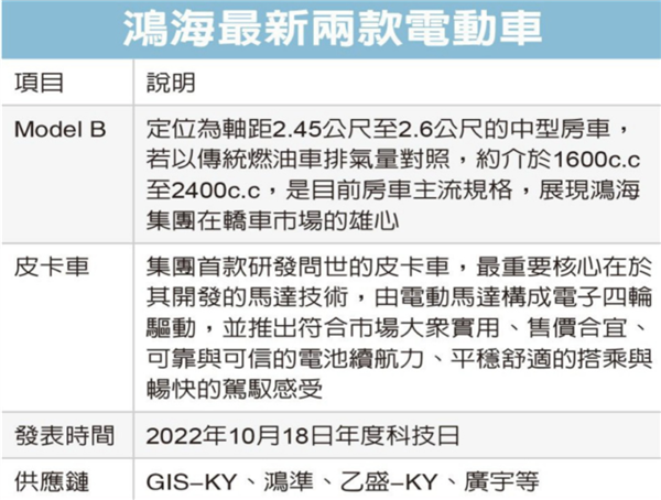 最新消息显示,鸿海内部正研发两款新电动车,包括Model B系列轿车和首款皮卡,预计10月18日的年度科技日亮相。